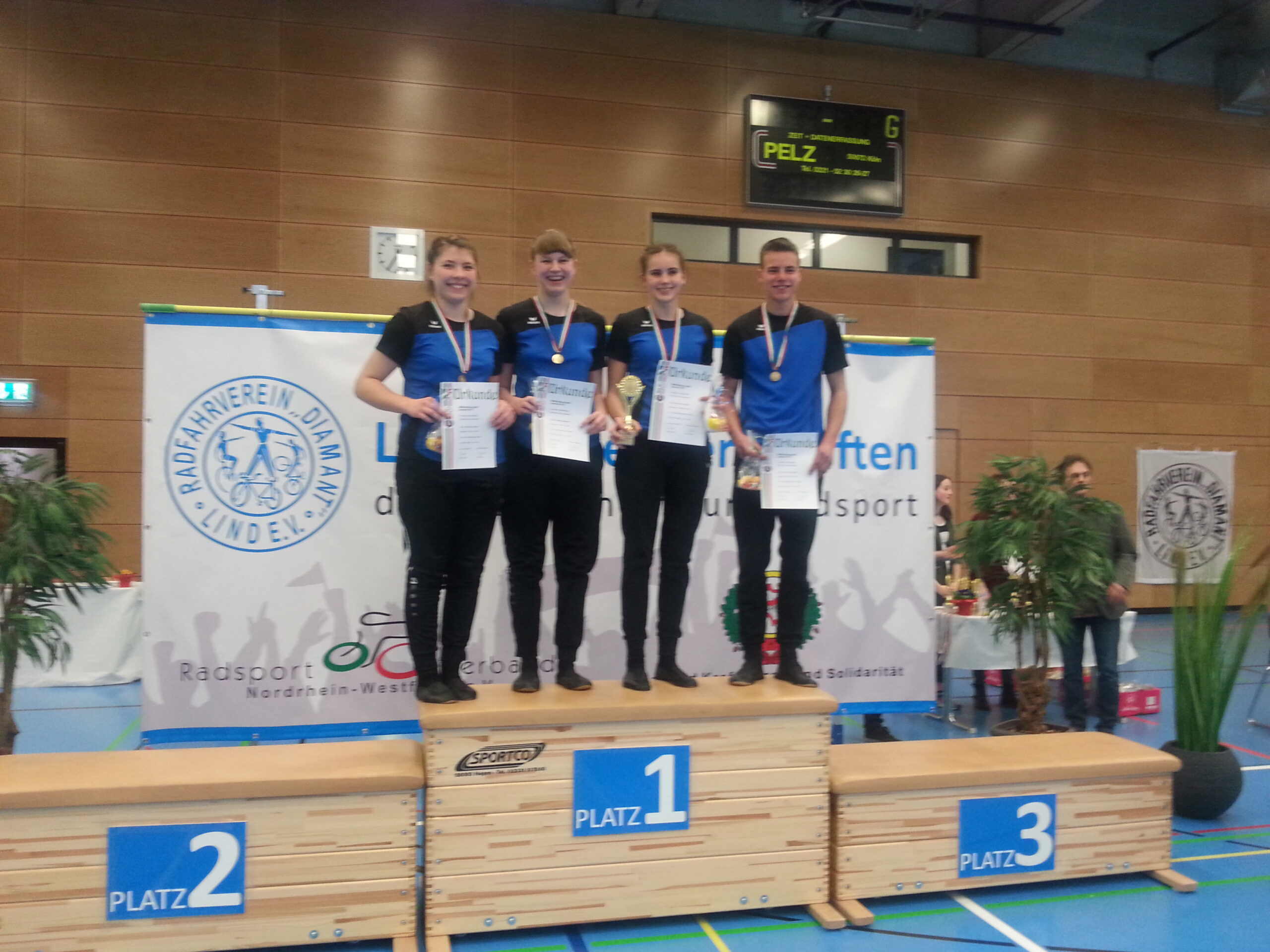 Die neuen Landesmeister im 4er Kunstrad Junoren offene Klasse kommen von der Sportgemeinschaft Augustdorf / Tempo Lieme mit Natalie Müther, Kim Hillmann, Ramona Petz und Simon Sielemann. Sie qualifizierten sich für das DM-Halbfinale, das am 1. April in Neuenkirchen (NDS) stattfindet.